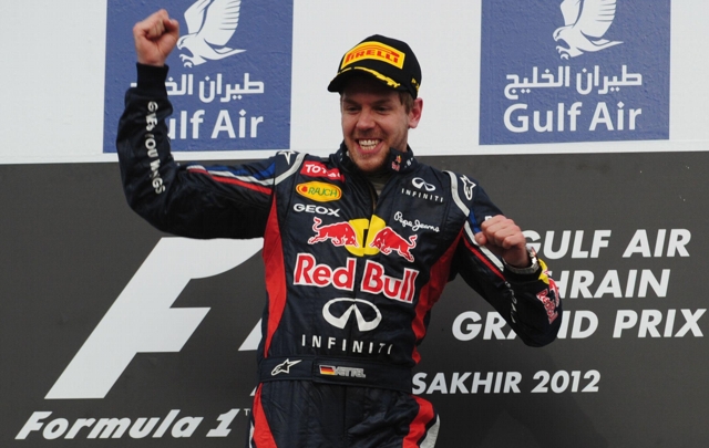 El alemán Sebastian Vettel (Red Bull) ganó el Gran Premio de Bahréin de Formula 1, la cuarta manga del mundial, al superar este domingo al finlandés Kimi Raikkonen (Lotus) y al francés Romain Grosjean (Lotus) en la carrera disputada en el circuito de Sakhir.
