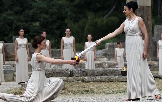 La sacerdotisa Ino Menegaki fue la encargada de proceder al encendido de la antorcha, siguiendo la tradición griega, en la que se invocaba al dios Apolo en el Templo de Hera, usando un espejo cóncavo para reflejar los rayos del sol.