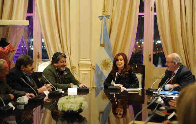 La presidenta Cristina Kirchner se reunió anoche con los dirigentes sindicales del frente antimoyanista en el Salón Eva Perón de la Casa de Gobierno, donde pidió a sus interlocutores "responsabilidad" y trabajar por "una sola CGT, unida".