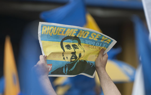 Los simpatizantes, con banderas, fotos y posters de Riquelme, se autoconvocaron a través de las redes sociales para pedirle al jugador que revea su postura, anunciada el miércoles pasado tras la derrota en la final de la Copa Libertadores frente a Corinthians de Brasil.