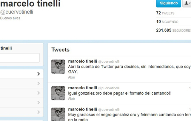 "Abrí la cuenta de Twitter para decirles, sin intermediarios, que soy GAY", rezaba el mensaje en la cuenta hackeada de @cuervotinelli. El conductor se ocupó de aclarar (por Twitter) que la cuenta había sido saboteada.