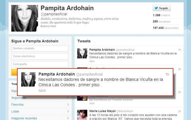 Luego, la modelo agregó: "Necesitamos dadores de sangre a nombre de Blanca Vicuña en la Clínica Las Condes, primer piso".