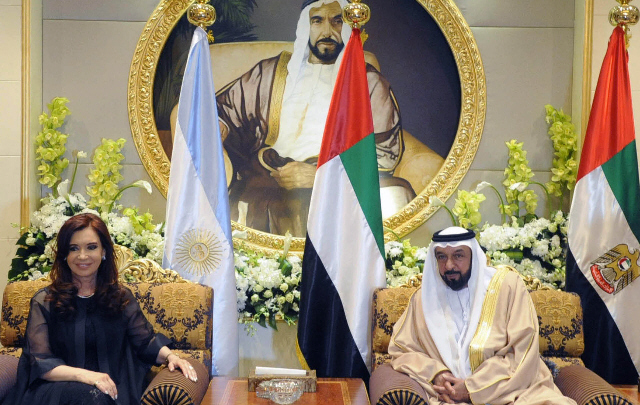 La visita de Cristina fue la primera que realiza un jefe de Estado argentino a los Emiratos, hecho que fue celebrado por Al Nahayan durante el encuentro en su residencia, cuyo tramo de ingreso lució decenas de banderas argentinas y de los Emiratos.