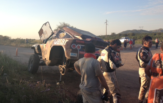 En diálogo con Cadena 3 desde el lugar donde se quedó el vehículo, Al Attiyah contó que se rompió un cojinete. "Tuvimos un problema adentro de la rueda y es imposible sacarlo", precisó. "Perdimos mucho tiempo, no pudimos arreglarlo y el service está muy lejos", agregó.