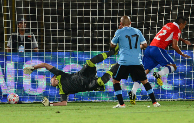 Luego de un error del defensor Martín Aguirregaray, a los diez minutos, quien tropezó al intentar parar una pelota en su área, llegó un centro bajo desde la izquierda de Jean Beausejour, la pelota rebotó en Álvaro Pereira y Paredes la empujó hacia el fondo del arco.