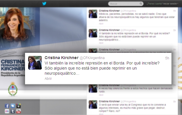 Un día después de los incidentes ocurridos en el hospital Borda, Cristina Kirchner cuestionó hoy la "increíble represión" que encabezó la Policía Metropolitana y apuntó contra la "justificación" que realizaron las "autoridades políticas" de la Ciudad, encabezadas por Mauricio Macri.