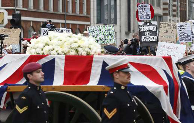 Entre el público hubo muestras de protestas contra las políticas de la "Dama de Hierro" y contra el gasto del funeral que, según cifras no oficiales, ascendería a 10 millones de libras.