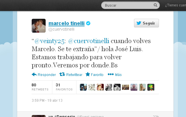 El regreso de Marcelo Tinelli a la televisión todavía no está definido y las versiones cambián casi a diario. Lo cierto es que el mismo Tinelli confirmó que la idea es regresar este año. "Estamos trabajando para volver pronto, veremos por dónde", contó en Twitter, en respuesta al mensaje de un usuario que le pidió por su vuelta a la TV. Algo similar le contestó a otro seguidor: "Estamos trabajando para volver este año", puntualizó.