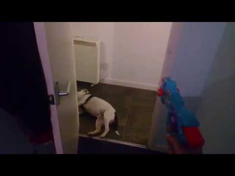 La grabación muestra el momento en que su dueño le dispara con un arma de juguete y el animal cae automáticamente desplomado en el suelo.