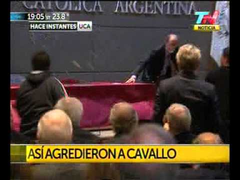 Al grito de "ladrón vendepatria" dos jóvenes irrumpieron ayer en el salón auditorio San Agustín de la Universidad Católica (en Puerto Madero) donde iba a llevarse a cabo una conferencia sobre el "futuro de la política monetaria". Le arrojaron huevazos y debieron ser reducidos por Prefectura.