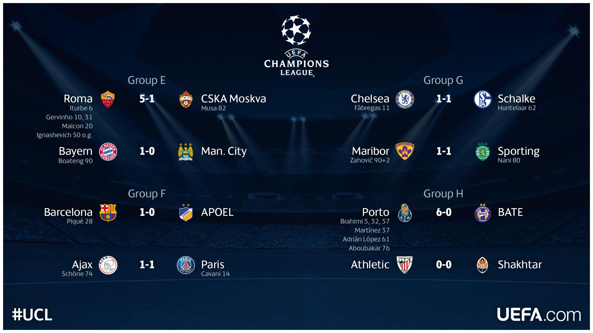 Este miércoles se disputó la segunda jornada de la primera fecha de la Champions League, correspondiente a los Grupos E, F, G y H. Entre los resultados más destacados se encuentran el triunfo de Barcelona, la derrota del Manchester frente al Borusia y la goleada de la Roma frente al CSKA de Moscú. Todos los Resultados (Imagen:
