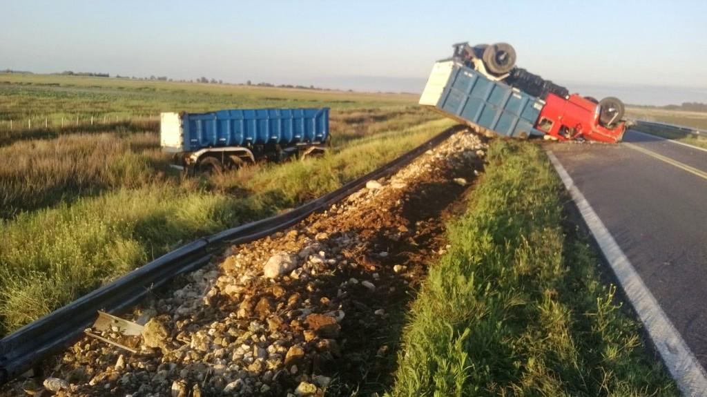 “El rodado mordió la banquina e impactó contra el guardarrail, cuando el chofer dio un golpe de volante para retomar a la cinta asfáltica cruzó a la mano contraria y se produjo el vuelco del transporte invertido con las ruedas para arriba...el acoplado hace el efecto tijera se desprende y vuelca también sobre la banquina ocupando media calzada”, describió el uniformado.