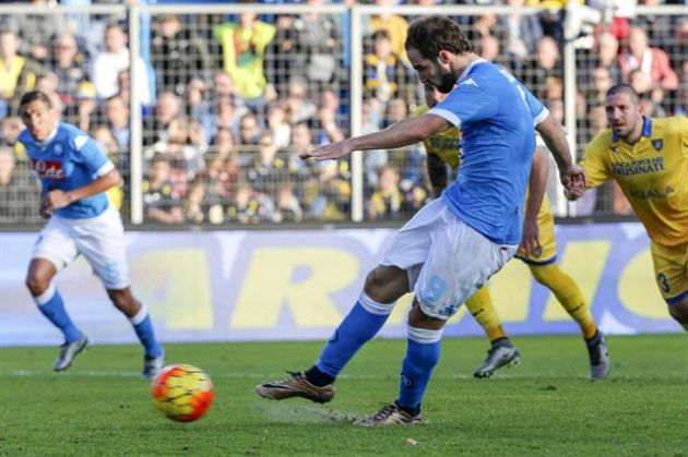El delantero argentino Gonzalo Higuaín marcó un doblete este domingo en la victoria 5 a 1 de Napoli ante Frosinone, por la 19° fecha de la Liga Italiana.