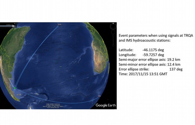 Improved location confidence #ARASanJuan: Updated Analysis using 2 Non-IMS seismic stations at regional distance (TRQA-Tornquist, Argentina, IRIS/USGS & EFI - Mount Kent, East Falklands Islands), that may have recorded associated signals w/ #CTBT #Hydro #acoustic stations Nov15 pic.twitter.com/h6vXq23gpa— Lassina Zerbo (@SinaZerbo) 28 de noviembre de 2017