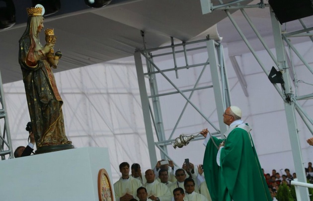 "Los invito a luchar contra esta fuente de sufrimiento pidiendo que se promueva una legislación y una cultura de repudio a toda forma de violencia", dijo Bergoglio durante la celebración mariana en la que fieles de toda la región norte le llevaron más de 40 imágenes de la Virgen.