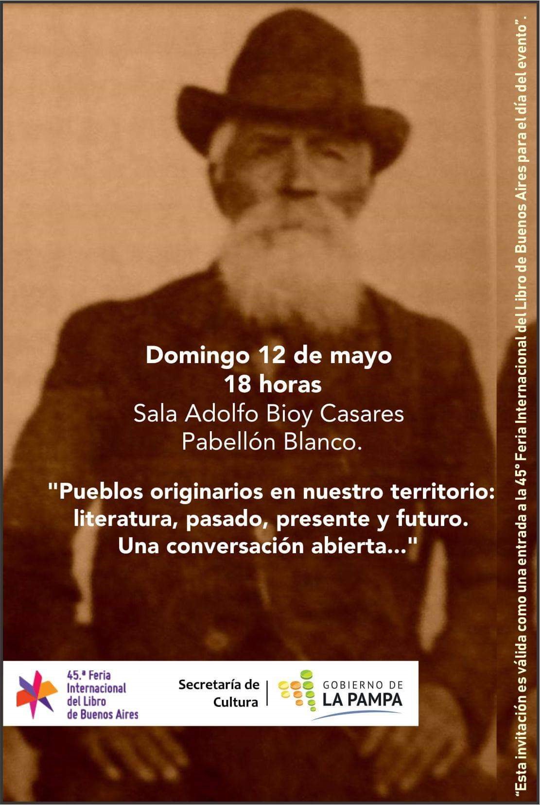 El domingo 12 de mayo será el acto del Día de La Pampa en la Feria Internacional del Libro, a partir de las 18, en la sala Bioy Casares - Pabellón Blanco, con una charla titulada: "Pueblos originarios en nuestro territorio: literatura, pasado, presente y futuro. Una conversación abierta…".