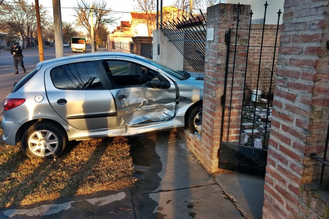 El vehículo de menor porte recibió un golpe muy fuerte en el lateral izquierdo para terminar rompiendo una reja de una vivienda e ingresado unos metros al patio de la misma.