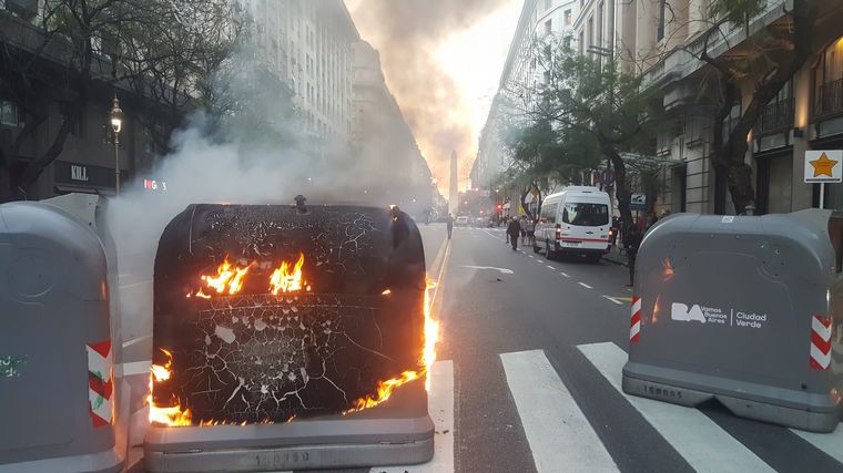 Los efectivos de la fuerza intentaron despejar la zona para permitir que los bomberos pudieran apagar los focos de incendio en distintos contenedores de basura en el lugar.