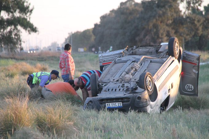 Uno de los autos, es VW Gol es un taxi-remis y el otro un utilitario, una Renault Kangoo. Este último quedó volcado sobre una de las banquinas con las cuatro ruedas para arriba.