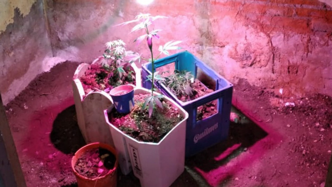 En el operativo se secuestraron 15 botellas de alcohol, un parlante digital y macetas con siete plantas de cannabis sativa.