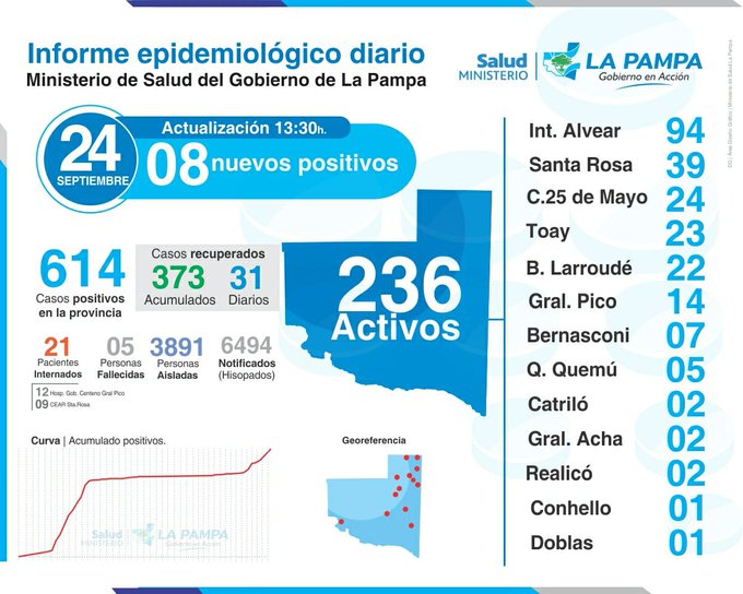 El Gobierno de la provincia de La Pampa, a través del Ministerio de Salud, comunicó que en horas de la mañana del día 24 de septiembre, se finalizó con el procesamiento de 41 muestras analizadas en los laboratorios de Epidemiología y de los Hospitales Lucio Molas y Gobernador Centeno, de las cuales 8 resultaron positivas para COVID-19.