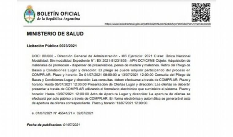El Ministerio de Salud de la Nación abrió una licitación para adquirir una serie de elementos, entre ellos 10 mil penes de madera pulidos y dispensers de preservativos, para concientizar y evitar la propagación de enfermedades de transmisión sexual por un costo de más de 13 millones de pesos.